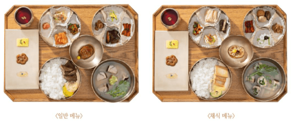 음식 구성은 두 가지 메뉴가 있습니다.. 채식 메뉴를 원하시는 분은 참여일 3일 전까지 티켓링크 콜센터 (1588-7890)를 통해 사전 신청하시기 바랍니다.