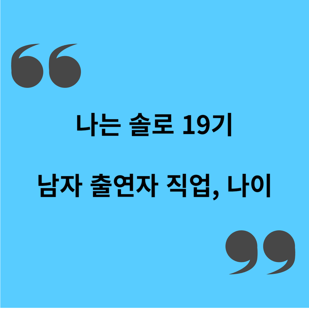 모두가 궁금해하는 출연자들의 자기소개 시간입니다. 나는 솔로 19기는 남자 출연자들만 자기소개가 방송되고 여자 출연자들은 다음으로 미뤄졌습니다. 다음 방송에도 열기가 뜨거울 것으로 예상됩니다. 지금부터 남자 출연자들의 직업, 나이 등에 대해 살펴보도록 하겠습니다.