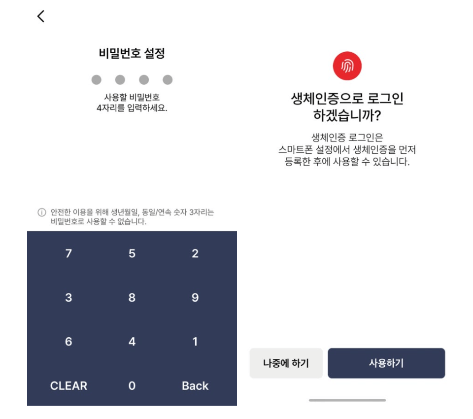 9. (선택사항) '생체인증'을 해두면 지문만 사용하여 편하게 사용할 수 있습니다.