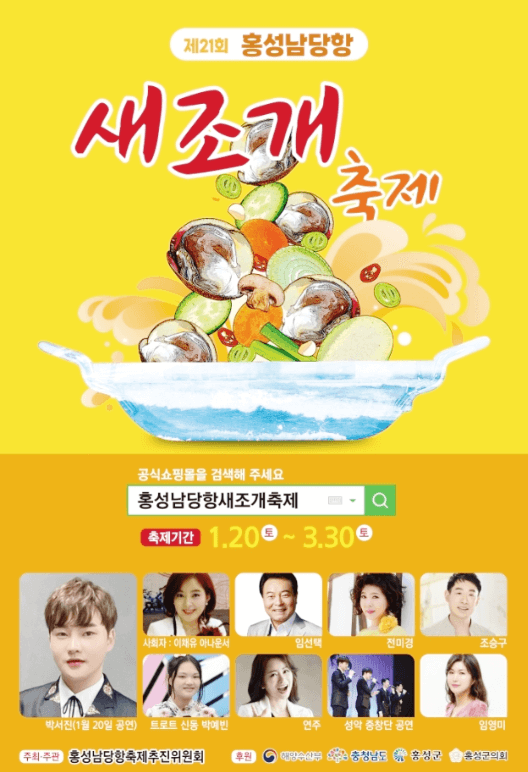 새조개축제는 매년 열리는 대표적인 축제 중 하나이지만,. 코로나19로 인해 개최되지 못했던 새조개축제가 2024년 홍성 남당항에서 3년 만에 개최가 되었습니다. 지금부터 새조개축제 기본정보에 대해 살펴보시고 방문하시어 맛있는 제철 음식인 새조개를 구매하시어 가족들과 함께 맛있게 드시길 바랍니다.