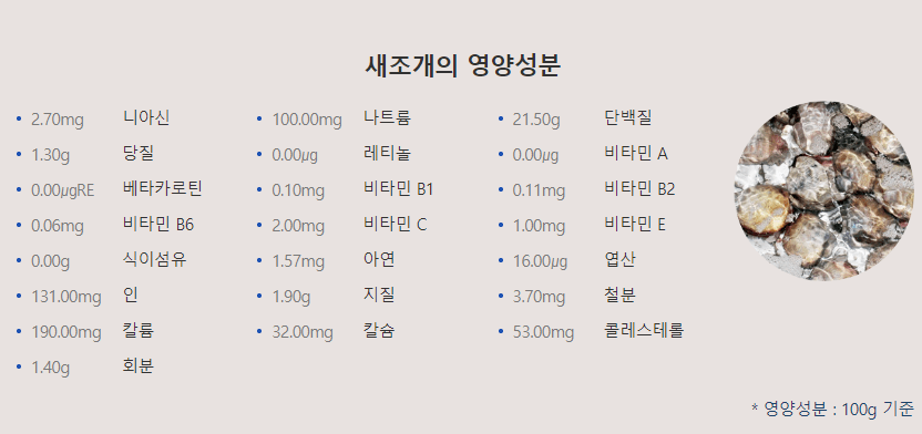이치목 새조개의 연체동물로 원형으로 볼록한 형태를 하고 있습니다. 주로 발 부분을 식용하며 닭고기 맛과 비슷한 맛이 난다 하여 인기가 있습니다.