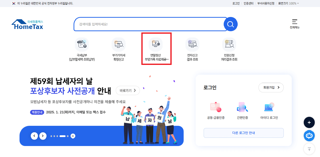 먼저 국세청 홈택스에 접속합니다. 로그인은 부양가족 본인이 해야 하며, 공동인증서 또는 간편 인증을 통해 로그인할 수 있습니다.
