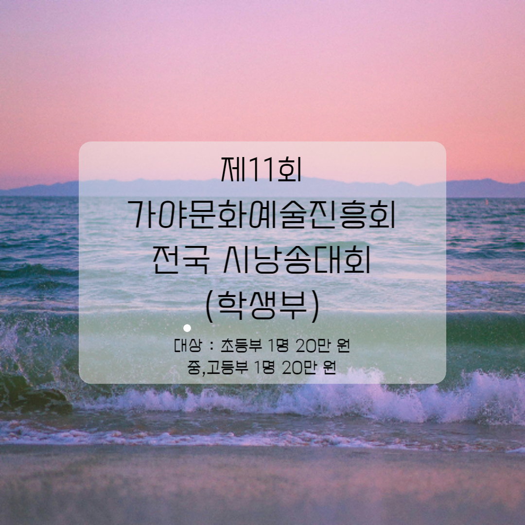 가야문화예술진흥회에서 개최하는 제11회 가야문화예술진흥회 전국시낭송대회 (학생부)를 개최하였습니다. 대상은 초등부 1명, 중·고등부 1명 각 20만 원을 수여됩니다. 내용 잘 살펴보시고 접수하셔서 상금 받아가시길 바랍니다.