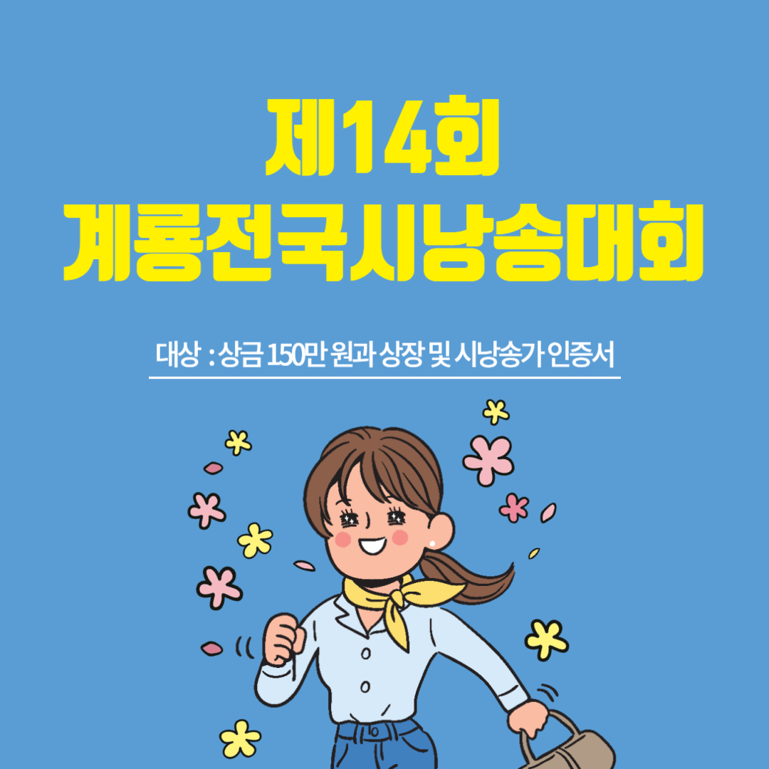 계룡전국시낭송경연대회추진위원회에서 제14회 계룡전국시낭송대회를 개최하였습니다. 대상은 상금 150만 원과 상장 및 시낭송가 인증서를 수여합니다. 꼼꼼히 살펴보시고 참여하시기 바랍니다.