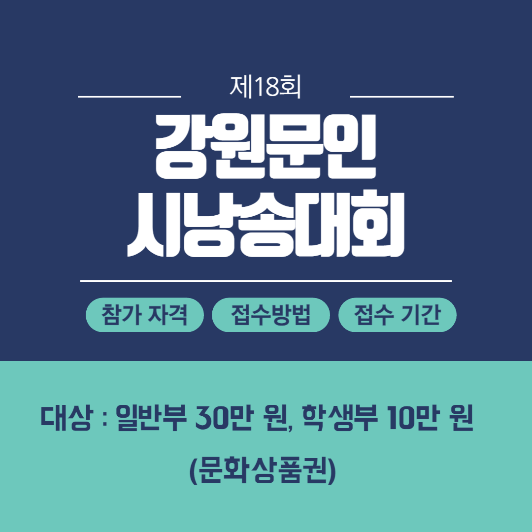 (사)한국문인협회 강원도지회에서 주최하는 제18회 강원문인 시낭송대회를 개최하였습니다. 대상은 일반부 30만 원, 학생부 10만 원(문화상품권)과 시낭송가 인증서를 수여합니다. 꼼꼼히 살펴보시고 참가하셔서 대상 받으시길 바랍니다.