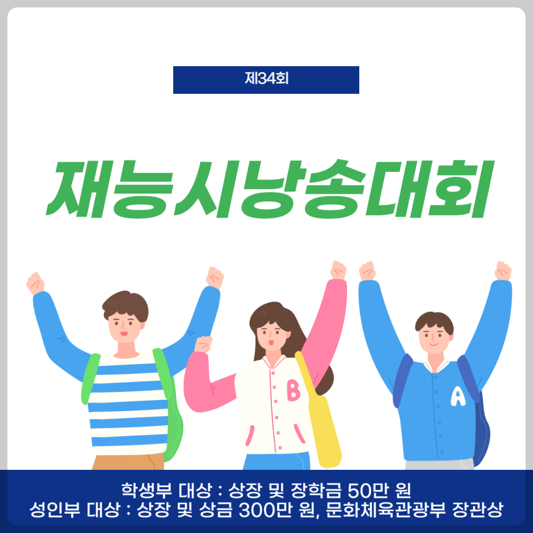 재능문화와 한국시인협회에서 주최하는 제34회 재능시낭송대회를 개최하였습니다. 학생부 대상은 상장 및 장학금 50만 원, 성인부 대상은 상장 및 상금 300만 원과 문화체육관광부 장관상을 수여합니다. 꼼꼼히 살펴보시고 참가하셔서 꼭 상금 받아가시길 바랍니다.
