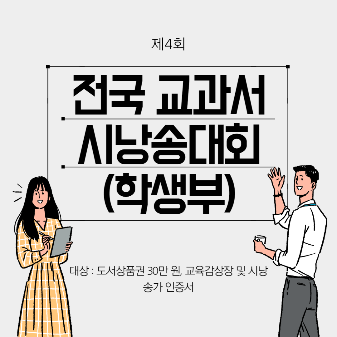 (사)시 읽는 문화에서 주최하는 제4회 전국 교과서 시낭송대회 (학생부)를 개최하였습니다. 대상은 도서상품권 30만 원과 교육감상장 및 시낭송가 인증서를 수여합니다. 꼼꼼히 살펴보시고 참여하셔서 꼭 상금 받아가시길 바랍니다.