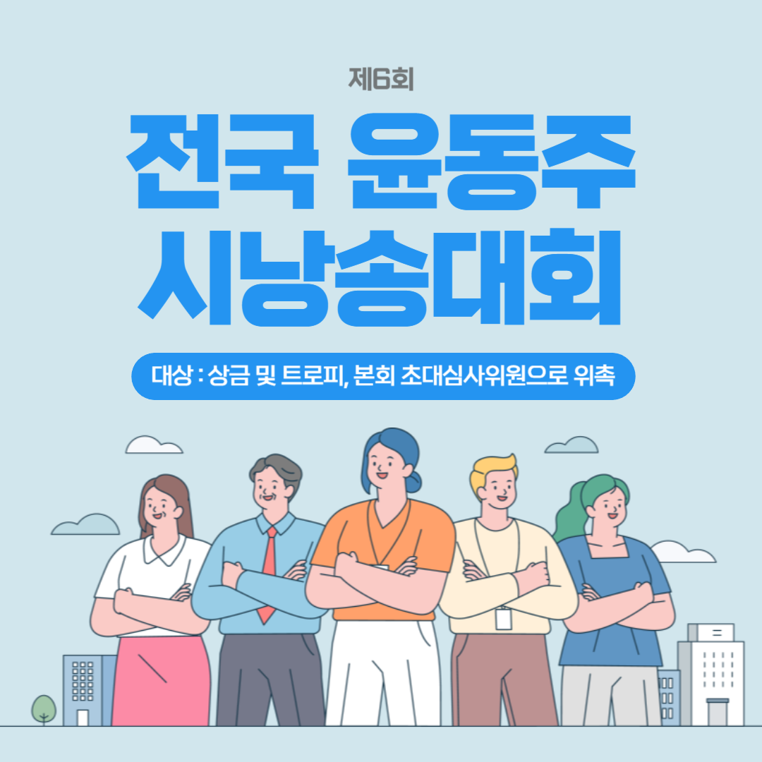 사단법인 윤동주문학연구보존회에서 제6회 전국 윤동주 시낭송대회를 개최하였습니다. 총 상금 800만 원을 대상 1명, 금상 2명, 은상 3명, 동상 4명, 장려상 5명, 특별상과 분배하여 수여받으니 참고하시기 바랍니다.