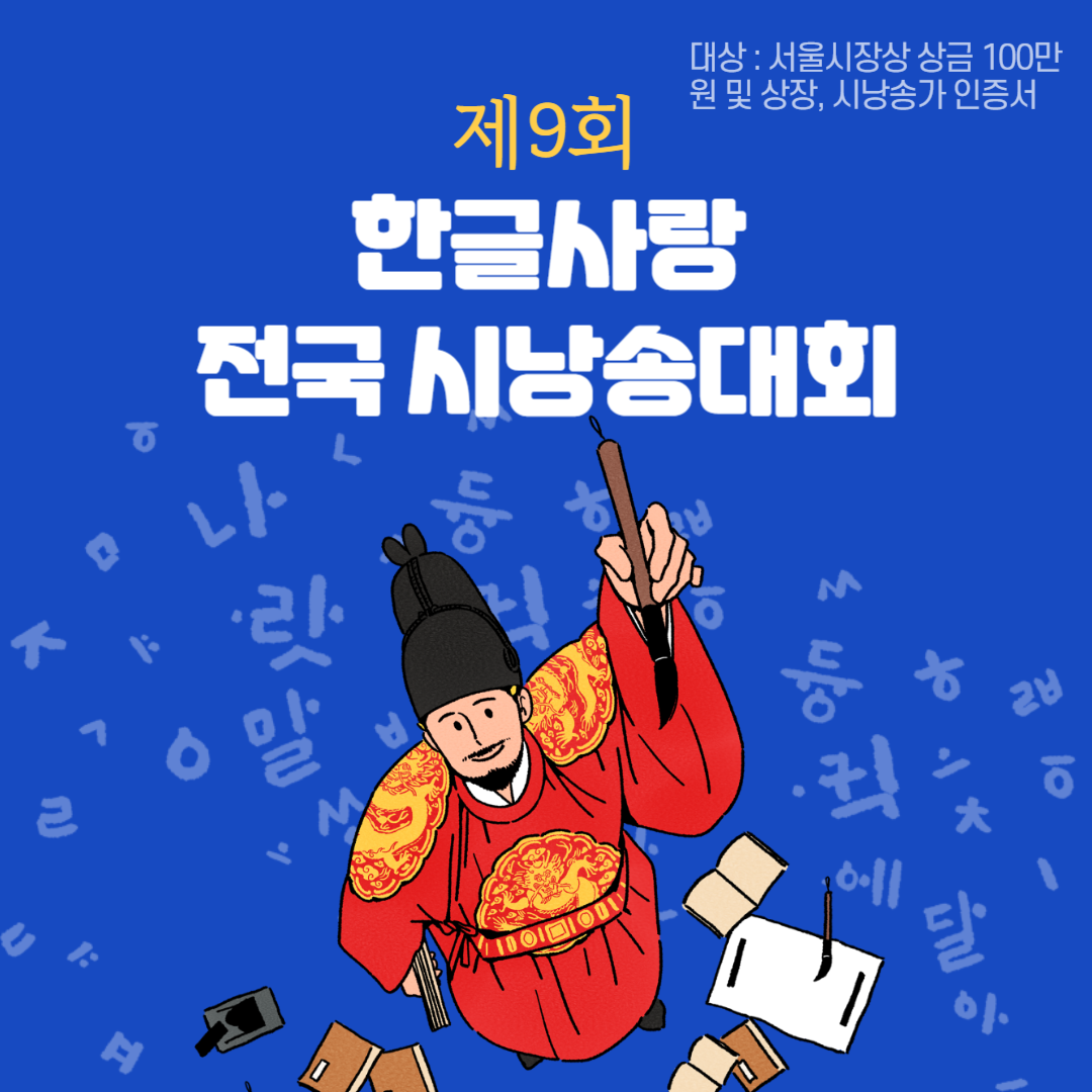 사단법인 한국문인협회에서 주최하는 제9회 한글사랑 전국시낭송대회를 개최하였습니다. 대상은 서울시장상 상금 100만 원 및 상장, 시낭송가 인증서를 수여합니다. 꼼꼼히 보시고 참여하시어 상금 받아가시길 바랍니다.