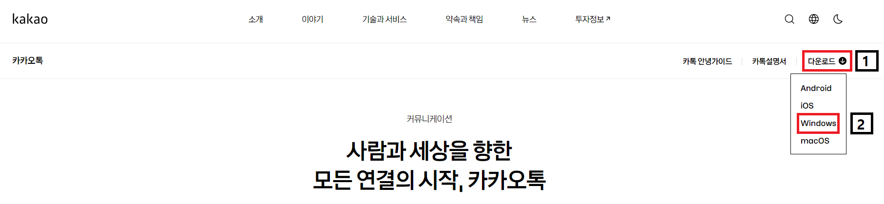 1. '카카오톡 pc버전 다운로드'를 클릭하시면 이 홈페이지 화면이 나옵니다. 상단의 맨 오른쪽에 다운로드를 클릭 후 windows를 클릭하면 다운로드됩니다.
