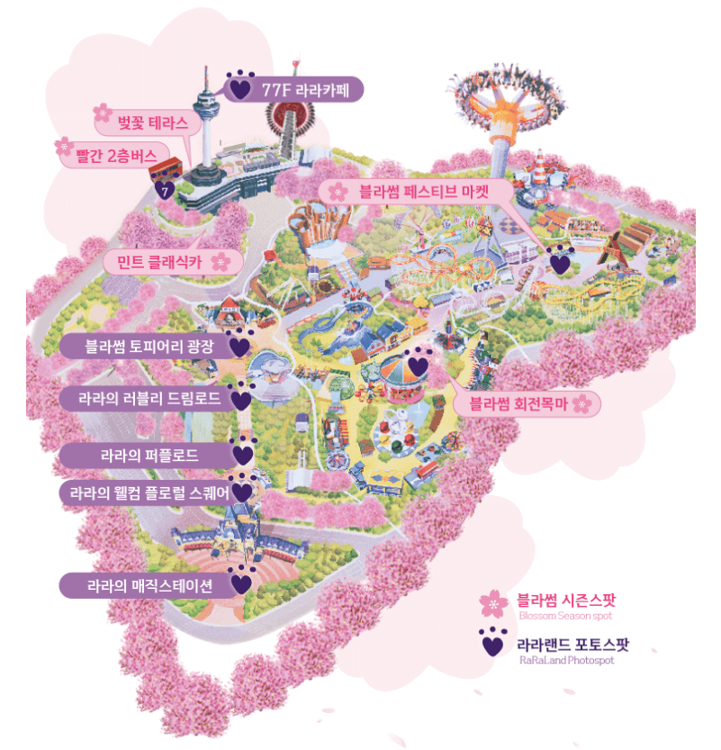 전국에서 가장 빠른 벚꽃이자 국내 최대 야간 벚꽃을 즐길 수 있는 이월드 벚꽃은 여의도보다 3배 많은 벚꽃 나무들이 이월드 전역을 벚꽃으로 물들여 봄의 정취를 느낄 수 있습니다. 낮에는 핑크색 벚꽃을, 밤에는 레인보우 블라썸 라이팅 쇼와 함께 화려한 빛으로 물든 벚꽃의 색다른 모습도 즐길 수 있습니다. <이월드 블라썸 피크닉>에서는 퍼플포토존, 회전목마, 빨간 2층 버스 등 다양한 벚꽃 포토존과 전망대에서 보는 벚꽃 스카이뷰 등 전국 어느 곳에서도 볼 수 없는 풍경이 이월드 내 가득 차 있어서 가는 발걸음마다 수백 장의 인생샷을 찍을 수 있습니다.