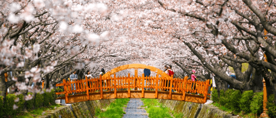 우리나라 대표 벚꽃축제 진해군항제가 2023년 3월 23일부터 4월 1일까지 9일간 개최됩니다. 이 시기 진해는 도시 전체가 벚꽃 천국이지만 그중에서도 '로맨스다리'로 알려진 여좌천은 1.5km 구간의 개천을 따라 늘어선 벚꽃나무가 일제히 꽃망울을 터뜨려 하늘을 뒤덮으며 절경을 이룹니다. 경화역 철길 따라 늘어선 아름드리 벚나무에서 나풀나풀 흩나리는 새하얀 꽃비는 낭만 그 자체입니다.